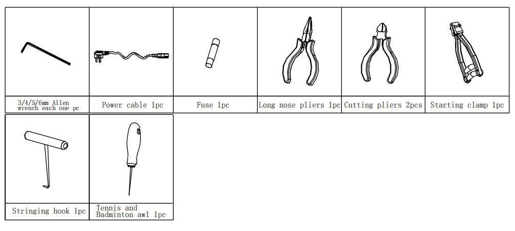 For S3169 rackets string machine , there is a full set of Tools together with the machine for clients , see below tools :